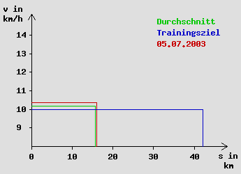 | 13.07.2003 | ca. 16 km | 1:29:35 | 165 | 23 °C | Recht flott unterwegs. Es hat den Anschein, dass die Grundschnelligkeit in letzter Zeit gestiegen ist. |