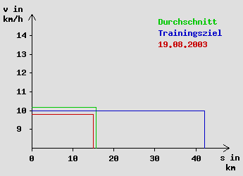 | 13.07.2003 | ca. 16 km | 1:29:35 | 165 | 23 °C | Recht flott unterwegs. Es hat den Anschein, dass die Grundschnelligkeit in letzter Zeit gestiegen ist. |