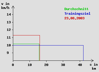 | 13.07.2003 | ca. 16 km | 1:29:35 | 165 | 23 °C | Recht flott unterwegs. Es hat den Anschein, dass die Grundschnelligkeit in letzter Zeit gestiegen ist. |