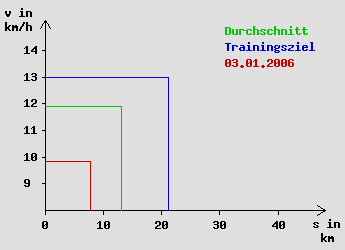 Dieses Diagramm zeigt die Verteilung und Länge der Trainingsläufe über den gesamten Zeitraum der Vorbereitung.    Dieses Diagramm zeigt den einzelnen Lauf (rot) im Vergleich zum Trainingsdurchschnitt und zum Trainingsziel.