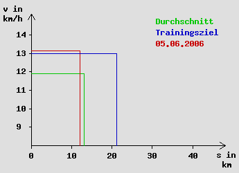 Dieses Diagramm zeigt die Verteilung und Länge der Trainingsläufe über den gesamten Zeitraum der Vorbereitung.    Dieses Diagramm zeigt den einzelnen Lauf (rot) im Vergleich zum Trainingsdurchschnitt und zum Trainingsziel.